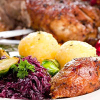 gebratene Entenkeulen mit Klöße und Rotkohl